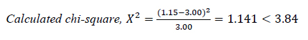 Chi-square test was carried out at a 95 percent level of confidence for one degree of freedom where X2 = 3.84 as taken from the chi-square distribution table. If calculated chi-square X2 < 3.84, it means is no significant difference between the PCE variables, hence the null hypothesis (HO) is accepted, X2 > 3.84, alternate hypothesis (H1) is accepted, that is, there is a significant difference between the PCE variables. For example, Eq. (12)