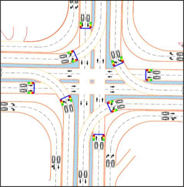 - Type (B) CFI: This CFI has two cross-over intersections on two perpendicular intersection approaches.