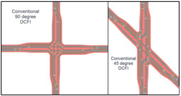 The study team has been involved in several studies and applications of unconventional intersection designs over the past few years. They have faced many challenges related to changes in the design features of the unconventional designs to solve issues in the site or local drivers’ behavior. There has been very limited research on the effect of geometric changes in the layout of DCFIs on their performance. This study aims to quantify the impact of modifying the geometric features of DCFIs on their operational characteristics. Mainly, the intersection angle between the different approaches of the main intersection and the angle of the minor cross-over intersections were investigated.