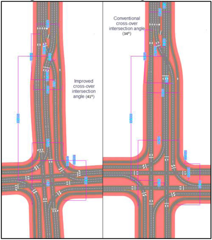 - Despite increasing the cross-over intersection angle, the total width of the carriageway at the cross-over and main intersections was reduced with the changed alignment angles.
