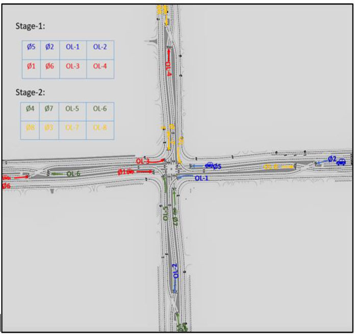 - 5- The main intersection is controlled by a two-phase signal where the phasing for the intersections will operate on two stages, as shown in Fig. (5).