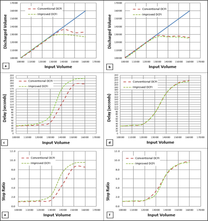 Table 2 shows the effect of changing the cross-over intersection angle, which had a minimal effect (less than 5% volume) on the discharged traffic volume through the intersections. However, the improved angle has an adverse effect on the discharged volume for the 90o DCFI because of the added curvature for the traffic leaving the main intersection. Volume-to-capacity ratio (V/C) measures the quality and mobility of a facility travel or a facility section [43-45]. When the traffic volumes approach the capacity, the added curvature affects the ability of the vehicles to maneuver smoothly through the intersection, and thus the discharged traffic volumes begin to drop. As for the 45o DCFI, there is no effect as the curvature already exists for the discharged volumes in the presence of the main intersection angle.