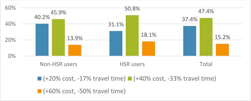 Fig. (10) illustrates a hypothetical scenario that aims to understand both HSR and non-HSR users’ trade-off between time and money. In this scenario, travelers were given three alternate options of travelling by HSR for a 600 km trip that typically took 120 minutes and cost ¥200. Each option facilitates a further 17 per cent reduction in travel time accompanied by a 20 per cent increase in travel cost. Fig. (10) shows that both HSR and non-HSR users preferred the second option, followed by the first option, with around half the travelers choosing an option that grants them medium travel time and cost, and almost 37 percent selected the cheapest option. Only 15 per cent picked the fastest option. These suggest that in China, sensitivity to travel cost is higher than to travel time. Zhao, Zhao [44] discuss that in the Chinese case, travelers find higher speed less important than departure and arrival times. Another finding is that HSR users are more concerned about the time and less sensitive towards the cost when compared with non-HSR users, affirming the higher levels of economic exclusion faced by non-HSR users, which was revealed by Table 2 earlier in this study.