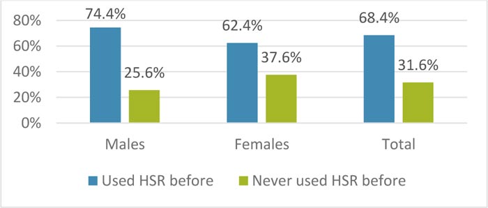 Fig. (2) illustrates that around 70 per cent of the sample has previous experience with HSR, compared to almost 30 per cent of those who have never used the system before. Noticeably, the number of male users is relatively higher than the number of female users. This might be related to the variation in social responsibilities and positions held by women compared to men, leaving females with less time and money to travel.