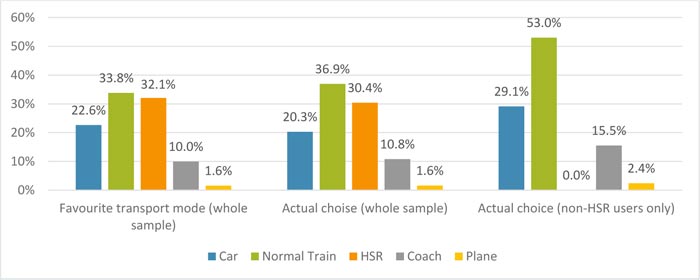 The study asked participants to state their preference regarding favourite transportation mode for a journey of 150 km or more and also the actual mode they chose -revealed preference- in their last trip of the same length. Fig. (3) shows that the results of stated and revealed preferences are close to each other, indicating that the normal train is the most favourable mode, followed by HSR and cars. Coaches and planes are much less popular when compared to other modes. Also, more than half of those who did not use HSR on their last trip have used the normal train. The popularity of the normal train over HSR could be related to several reasons. Normal trains are more frequent and typically offer cheaper tickets and more options in terms of departure and arrival time. Moreover, those who are not very concerned about travel time can travel by normal trains at night considering the availability of sleeper options. Furthermore, it is easier to reach normal train stations, which are usually located in the city centre while HSR stations -in most cases- are in peripheral zones in urban suburbs, making it harder to reach them due to longer access/egress times [6, 40, 41].