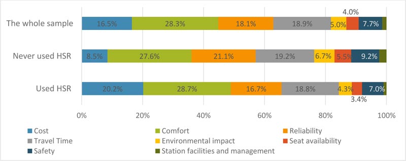 In many European countries, travel time is the most favourable factor for using HSR [2]. However, the case study showed that in China, comfort is regarded as the most favourable factor, followed by travel time and reliability. The experience of HSR is relatively new in China, especially when compared with other European countries. In China, HSRs are perceived as a new, comfortable, and clean transport mode, featuring comfortable seats, plenty of leg rooms, air-conditioning, and on-board food, drinks, and other services that are not available in other modes [45].