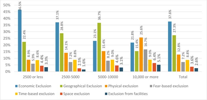 In terms of validity, the study used a survey that is thoroughly researched, influenced by, and based on existing knowledge. A similar survey has been used and verified by other studies such as [17-19]. Also, the results of the survey were compared through benchmarking exercise with authenticated results of other studies in different countries. Benchmarking results against findings of similar studies in other countries confirmed the dominance of economic exclusion followed by geographical exclusion. The similarity of findings enhances the validity of the results of this study [55]. Still, statistical validation of the sample size and results would enhance the findings of the paper. Without such validation, results and findings are limited to the sample of 3353 respondents and cannot be generalised to the Chinese population.