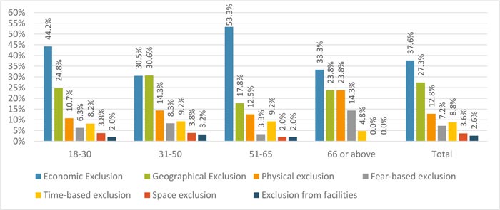 The relationship between social exclusion categories and the age of non-HSR users is presented in Fig. (6). Except for the middle-aged group, economic exclusion prevails in all other groups, followed by geographical and physical exclusions, respectively . Noticeably, the 51-65 age group suffers the strongest economic exclusion compared to other groups.