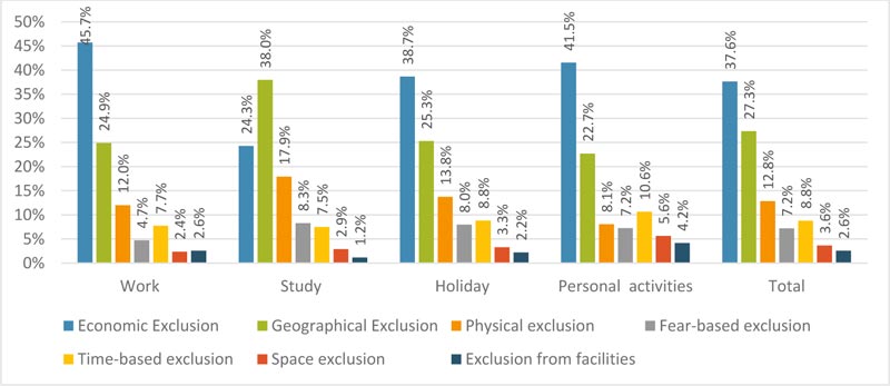Fig. (7) shows social exclusion categories based on the trip purpose. Economic exclusion dominates other exclusion categories for people who travel for work, holiday, and personal purposes. Respondents who travel for work commitments face the strongest level of economic exclusion. For those who travel for study purposes, the geographical exclusion is the highest category. Students enjoy discounts on their HSR tickets [43], and hence they are less excluded for economic reasons. However, students might be living in rural and peripheral urban areas where HSR stations are relatively far and harder to reach.