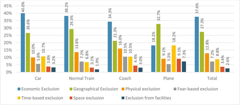 Finally, the relationship between social exclusion categories and chosen transportation mode is summarized in Fig. (8). The highest level of exclusions received by car, regular train, and coach users are economic exclusion followed by geographical exclusion. Only in the case of plane users the geographical exclusion dominates other exclusion categories. This is understandable since travelling by HSRs in China is relatively more expensive than travelling by car, normal trains, and coaches. In contrast, travelling by plane could be much more expensive than travelling by HSRs, and since air users are less concerned with monetary costs, they are concerned with geographical and time-based exclusion. This might be explained by the fact that plane users in China find it easier and more convenient to reach an airport than to reach an HSR station. Another possibility is that airports provide special facilities such as VIP and business lounges, which might not exist in stations.