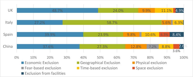 Responses to the hypothetical scenario showed that passengers were more concerned about travel cost than travel time. However, this trend changes with higher incomes and people with the highest income prefer the fastest travel option. China was similar to Spain, Italy, and the UK with regards to the fact that the economic and geographical exclusions are the strongest among other categories of exclusion. However, respondents in China perceived the highest levels of physical and fear-based exclusions when compared with other countries.