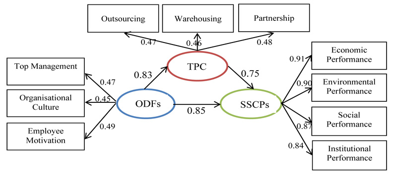 The results of the correlation analysis amongst the three latent variables: organisational driving forces, transportation practices during the COVID-19 crisis, and sustainable supply chain performance, found that all of them had correlation coefficients different from zero with statistical significance at the level of 0.01, as shown in Table 1. The most correlated variables were transportation practices during the COVID-19 crisis and sustainable supply chain performance (0.881), followed by organisational driving forces and sustainable supply chain performance (0.855), and organisational driving forces and sustainable supply chain performance (0.845), respectively, by which all variables were correlated in the same direction, as shown in Table 1.