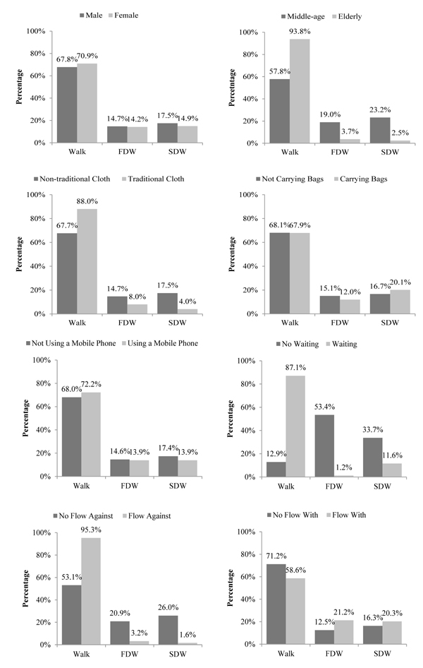 Several studies investigated the influences of personal features on street-crossing behavior. Pedestrian characteristics such as gender and age have been shown to be important contributing factors to pedestrian violations. Many studies have reported that male pedestrians violate traffic rules more frequently than females and are more likely to cross in riskier situations [7-11]. One study showed opposing findings with male pedestrians observed to be more likely to comply with traffic rules on signalized crosswalks [12]. When it comes to age, previous studies showed that older pedestrians wait for a longer time than younger ones at crossing signals [7] and they also appear to be more inclined to comply with traffic laws [12-14]. In some cases, age failed to yield significant differences in offending crossing behaviors [9].