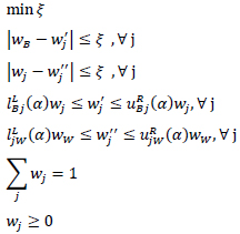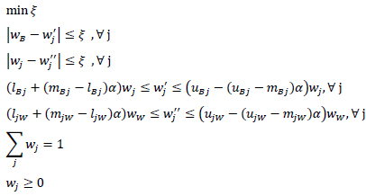 The FBWM model presented in Equation (4) can be formulated as Equation (5). The advantage of Equation (5) over Equation (4) is that there is no need to perform α-cut operations on expert preferences, and therefore there is no need to perform the Step 5 in the FBWM implementation. In fact, α-cut operations on fuzzy numbers are included in the constraints of Equation (5).