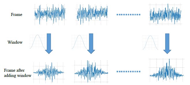 In order to keep the smoothness of each end of the frame, sound frames are windowed. The process of windowing is shown in Fig. (10). Windows are usually a rectangular window, Hanning window, and Hamming window [17]. The window function as follow: