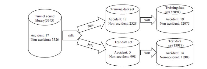 The sound sampling rate set in this experiment is 48000Hz. First of all, accident sound and non-accident sound are split into a training data set and a test data set according to the proportion of 7:3. Then the sound files of the training data set and the test data set are preprocessed, respectively. Each frame's size is 2048 sampling points, and three frames are taken as a sample by VAD. A total of 46011 experimental data samples were generated after VAD processing. After manually labeling the data samples again, there are 33 tunnel accident sounds and 45978 non-accident sounds in the data. The split process of test data and training data in specific experiments is shown in Fig. (13).