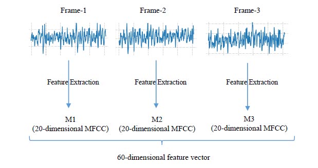(1) Method 1 is to combine the MFCC feature vectors of 3 frames, and the final feature vector is (M1, M2, M3). Its dimension is 60.