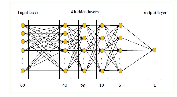 The neural network used in our experiment is a fully connected neural network, and its structure is shown in Fig. (16). In fact, I conducted a lot of choices on the number of neural network layers and nodes in my experiment were seen. For example, the number of hidden layers is 5, and the number of nodes is 200, 100, 50, 20, 5, respectively. And found that as long as it is not extreme, similar results can be obtained. The input layer is the MFCC feature extracted, and the hidden layer uses the Relu activation function. The only node in the output layer represents the predicted result. And the output layer uses the sigmoid function, which ensures that the input result is between 0 and 1. If its value is close to 0, the prediction result is accident sound. On the contrary, if its value is close to 1, the prediction result is non-accident sound. The optimization method is the Adam algorithm [30]. The loss function uses the mean squared error function [31]. Our models use mini-batch gradient descent to learn, and the batch size is 200. The learning rate is 0.002, and the number of training times for each model is 5000 times.