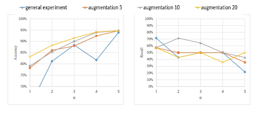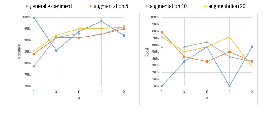 The final experiment is an orthogonal experiment with two variables. Variable one is the amount of accident sound augmentation, and variable two is the ratio of accident sound to non-accident sound. We used method 1 and method 2 to do two sets of experiments. The experimental results on the test data are shown in Figs. (17 and 18). Abscissa α indicates that the ratio of accident sound to non-accident sound in the training data is 1: α . The vertical coordinates of each line of figure from left to right are accuracy and recall, respectively. The blue line indicates that a “general experiment” means that the sound is not augmented. The orange line “augmentation 5”, the gray line “augmentation 10” and the yellow line “augmentation 20” are the augmentation of the accident sound by 5 times, 10 times and 20 times, respectively. Compared with method 2, method 1 has better performance in accuracy. However, in method 1, we can see that the recall rate is very variable. That is because sometimes the model performs well on the training data, but may not perform well on the test data. As shown in Figs. (17 and 18), as the alpha value increases, the accuracy of each method roughly increases. This is because the accident sound is not balanced compared to the non-accident sound, resulting in a certain degree of overfitting.