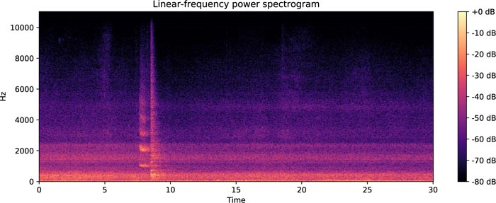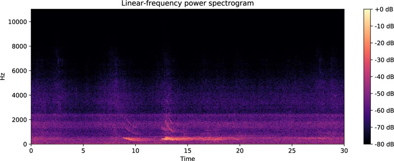 From November 2018 to April 2019, total 3343 sounds were detected, and each sound file was 30 seconds. We call these sounds abnormal sounds. After watching and listening to CCTV, the company staff classifies abnormal sounds into 14 classes of sound types. The statistics of sound classes are shown in Fig. (3). The sound library is built through the already acquired 3343 tunnel sound data and the number of new occurrences in the future. Because clash sounds are the object of our attention, we divide each sound file into accident sounds and non-accident sounds. The accident sounds include clash sounds, and the other 13 sounds are non-accident sounds. Figs. (4 and 5) show examples of spectrograms of an accident sound and a non-accident sound. The spectrogram is obtained by dividing a long sound signal into frames, adding windows, and then performing fast Fourier transform for each frame. After that, the results of each frame are stacked along another dimension to get a picture. The horizontal axis represents time, the vertical axis represents frequency, and the brightness of color represents amplitude.