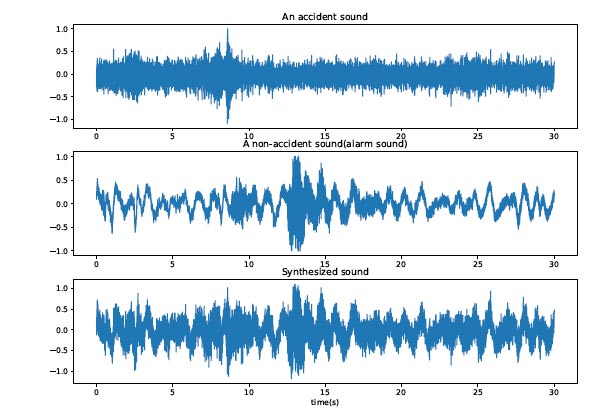 Fig. (6). Time-domain diagrams of an accident sound, a non-accident sound and their synthesized sound.
