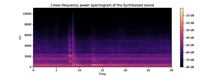 For example, the accident sound in Fig. (4) and the alarm sound in Fig. (5) are combined to produce a synthesized sound. Fig. (6) is their time-domain diagram. From the time-domain diagram, we can see that although the noise is not reduced after the sound is combined, the time-domain characteristics of the original sound still exist. Around the 8th second in the accident sound and around the 13th seconds in the alarm sound, these peaks (the moment when there is an abnormal sound) all appear on the synthesized sound. Fig. (7) is the spectrogram of the synthesized sound, and we can see that the synthesized sound still has the frequency characteristics between the two sounds. Obviously, such a combination method helps to augment the accident sound data of the experiment and helps the learning of the classifier.