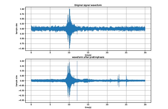 where x(t) is the signal after resampling. α is the pre-emphasis weight. xpre-emphasis(t) is the signal after pre-emphasis. Fig. (8) shows the results of the time domain before and after the pre-emphasis of an accident sound. It can be seen from the figure that some parts of the signal have been enhanced and the noise is weakened.