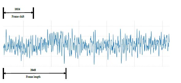 The sound signal is a time-varying signal that is stable for a short time [15]. A short and stable sound clip can be used as a frame. This frame is intercepted from a fixed characteristic continuous sound. This process is called framing [16]. In order to ensure the smoothness between frames and the continuity of sound signals, it is usually processed by overlapping frames. In human voice recognition, the length of each frame is between 10ms and 40ms, and the frame shift size is usually half of the frame length. If the framing is too short, there will be an insufficient frequency domain. If the framing is too long, the signal will be unstable, and the frequency domain conversion will become worse. The accident sound is the sound of a clash, which generally lasts for a long time. After our experimental test, it has a good performance when we select 2048 signal sampling points (about 42ms) as the frame length and 1024 signal sampling points (about 21ms) as the frame shift. An example of framing is shown in Fig. (9).