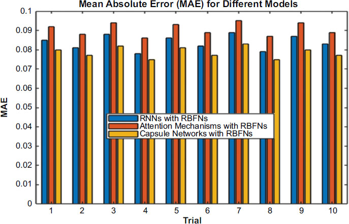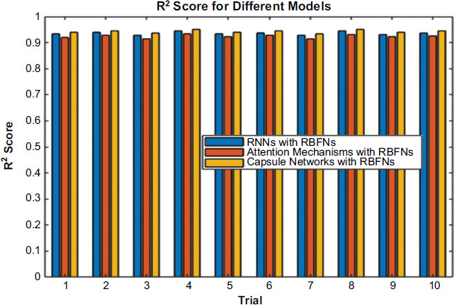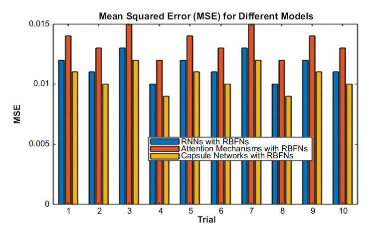 It examines such combined models as RNNs with RBFNs, Attention Mechanisms with Radial Basis Function Networks (RBFNs), and Capsule Networks with RBFNs and clearly shows that, in all cases, compared to the others, the former model has a Mean Squared Error (MSE) of 0.010 to 0.013, Mean Absolute Error (MAE) – 0.078 to 0.088, and R-squared (R2) – 0.928 to 0.945, across ten experiments. In the case of Attention Mechanisms with RBFNs, the models also demonstrate strong performance in terms of making predictions. The MSE ranges from 0.012 to 0.015, the MAE from 0.086 to 0.095, and the R2 from 0.914 to 0.933.