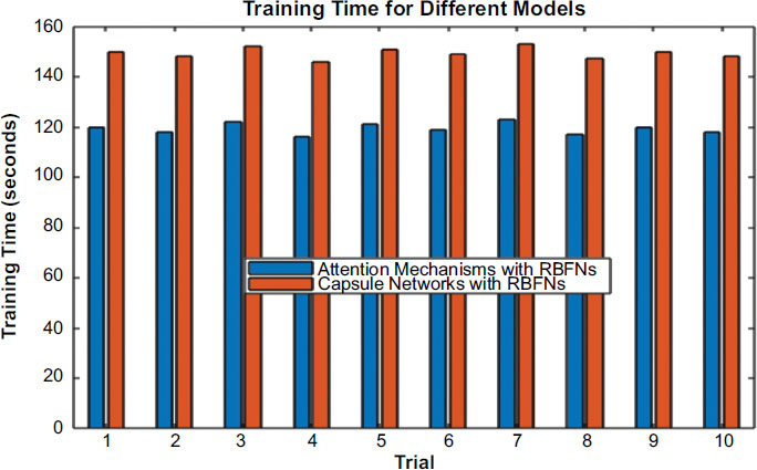 While the attention mechanisms can provide a substantial improvement in interpretability and feature selection, they also increase the computational burden of the models, leading to increased training times. On the other hand, from Fig. (6), the Capsule Networks with RBFNs model showed the lowest MSE and MAE values as compared to the other two models. Specifically, the MSE values ranged from 0.009 to 0.012, and the MAE values were between 0.075 and 0.083. Similarly, the R ^ 2 values were incredibly high, varying from 0.935 to 0.950. Overall, the RNNs with RBFNs model had similar training times between 146 and 153 seconds. These results mean that the Capsule Networks offer the best model for accurate prediction and estimation of transportation-related variables. Additionally, it shows that the Capsule Networks with RBFNs provide a robust regression framework for applications in transportation and logistics.