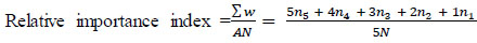 The data collected were statistically analysed using the Statistical Package for Social Sciences (SPSS) package, and the results were analysed using MS Excel. Further analysis was performed through the Relative Importance Index (RII) [36, 37] and the chi-square test to establish the importance level and relationship between variables, respectively. The RII has significant value for this study, as its outcome signifies the ranked degree of relevance of a particular aspect. It proves especially useful for surveys utilizing a Likert scale [37]. As illustrated in Eq. (1), the RII formula was integrated into Microsoft Excel, which enabled us to calculate the index for distinct sets of responses or items.