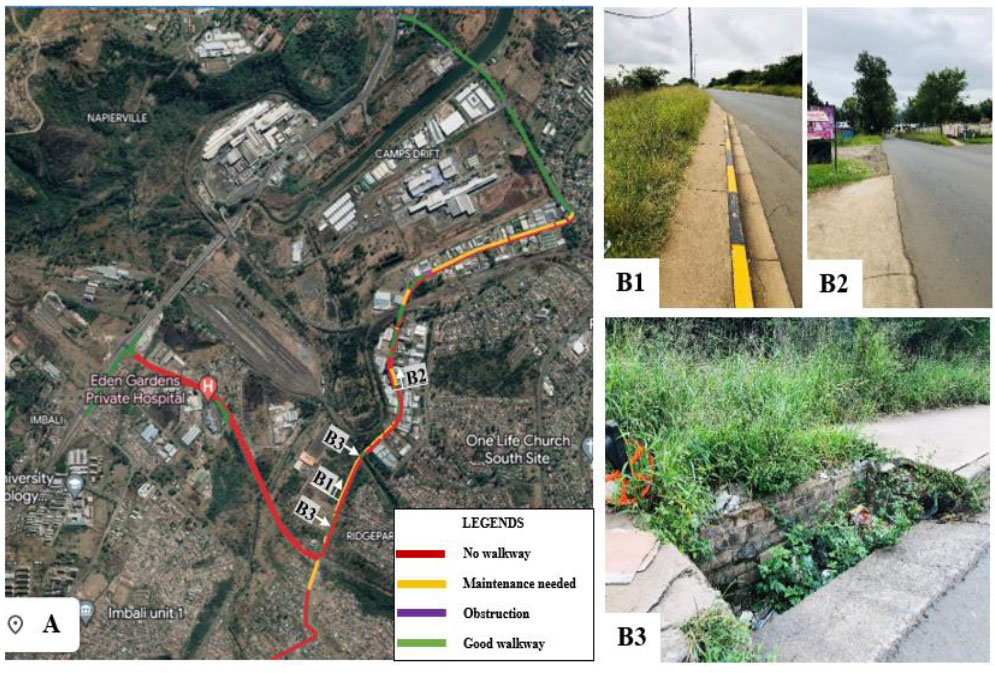With a comprehensive understanding of pedestrian movement, the study then undertook an on-site observational visit to assess the current state of pedestrian facilities. Precise measurements of the pedestrian walkways were meticulously recorded and subsequently benchmarked against the standards recommended by the South African Pedestrian and Bicycle Facility Guidelines, a set of directives outlined by the Department of Transport. The findings, along with the physical condition of the walkways, were generated using ArcGIS, as illustrated in Fig. (3A).