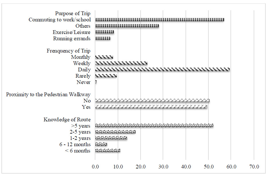 When examining the condition of pedestrian walkways, the chi-square analysis revealed the elements, such as safety, accessibility, and cleanliness, to be related to the respondents’ monthly household income. Furthermore, the degree of familiarity with the route significantly influenced the respondents' perceptions of the pedestrian walkway's condition.