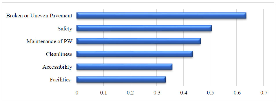 Furthermore, the cleanliness (RII = 0.434) and maintenance (RII = 0.464) of the route also garnered significant attention from the respondents. In the ranking spectrum, accessibility appeared second to last, while facilities specific to pedestrians were the least concerning issue. However, it is essential to note that these viewpoints could vary depending on the stakeholder's perspective. From the pedestrians’ viewpoint, the comfort and walkability of pathways tend to take precedence.