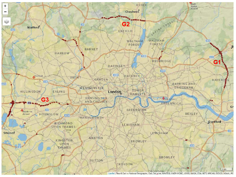 The relationships were applied using traffic flow data from the Highways England’s Application Programming Interface (API) [58] and car accident data from the Transport for London (TfL) API [59]. For both datasets, Rstudio was used to download data in JSON formats [60]. Highway cameras’ locations, together with car accidents, were inserted, projected, and plotted using their coordinates in Rstudio [61] and the “qtm” function for plotting [62]. As the car accidents dataset includes car accidents only from some areas of the highways, all cameras that do not intersect with these areas were excluded. The cameras left can be divided into three (3) groups: G1, G2, and G3 (Fig. 2).