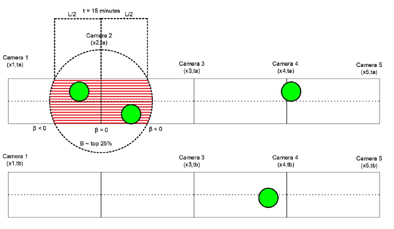 Parameter β refers to a road segment {x1, x2}. Therefore, we get the values v and ρ using the following two cameras: the camera at the beginning of the road segment and the camera at the end. The average of the values of the two cameras is used to get the characteristics of the segment as shown in Eqs. (A.2 and A.3):