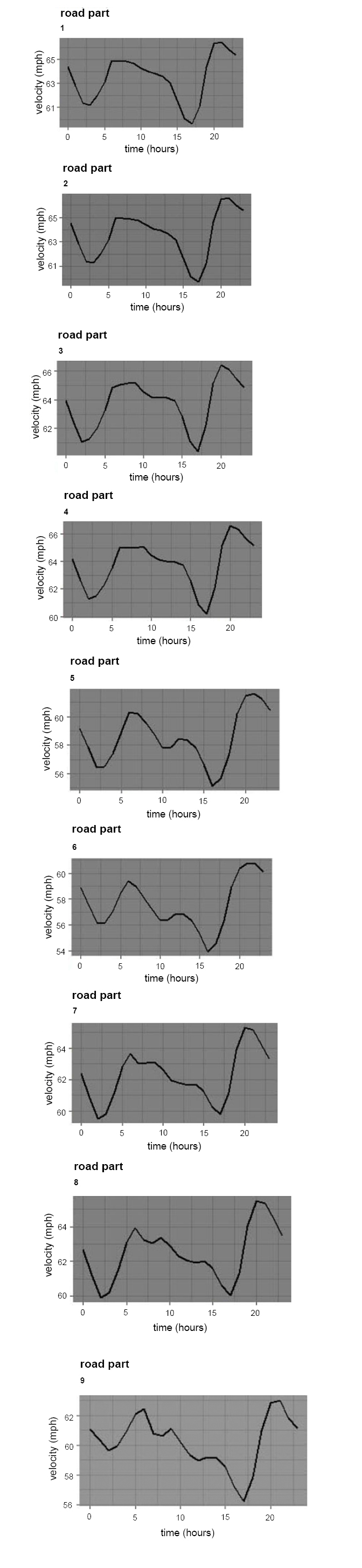 In this paper, we assume that all drivers perform the same estimations about their journey. This does not indicate that they perform the same journey but that all the drivers expect to find the same driving conditions in each road segment. Even though this assumption limits the findings of this research, it could be considered valid when the drivers are experienced. The reader can find an indicative figure about drivers’ expectations in the appendix. Calculating the hourly average velocities, we can see some spatial and temporal patterns that can be easily guessed/expected by the drivers. The aforementioned assumption makes it possible to create a “hypothetical” driver whose velocity is identical to the hourly average velocity of the drivers of each segment.