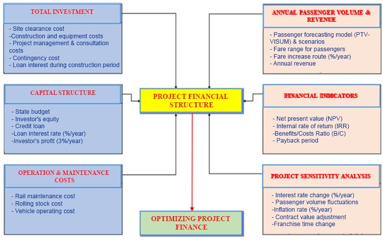The financial model of the project is created in the project preparation phase and continuously developed, improved, and updated. For rail infrastructure investment enterprises to make the right decisions in choosing the timing and investment roadmap, identifying the model along with influential factors plays a crucial role. Within the framework of the article, the financial model of the HSR project is limited to direct revenue sources from fares and passenger flows (not considering business services in the station area); simultaneously, it represents the related influencing factors according to the block diagram in Fig. (2).