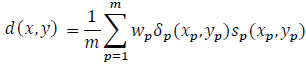 where d(x, y) represents the Gower distance between points x and y, quantifying dissimilarity across m variables; wp is the pth variable's weight, often 1 for equal treatment but adjustable for variable importance; δp(xp, yp) is 1 unless xp or yp is missing; sp(xp, yp) scales dissimilarity, using absolute difference for numerical and 0 or 1 for categorical variables. The summation of all variables, normalized by 1/m, calculates the mean dissimilarity.