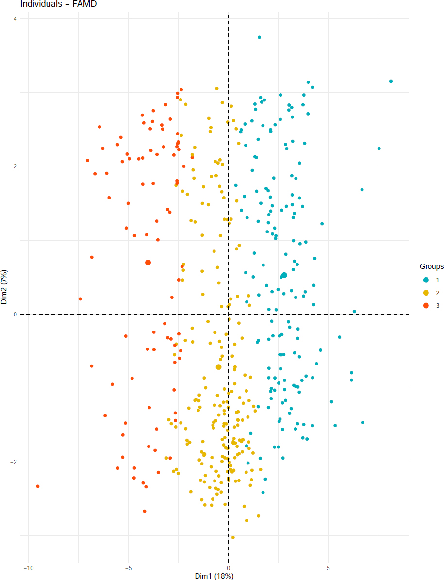 The dataset under study consists of 461 observations, each described by 21 variables including 14 numerical and 7 categorical. The clustering algorithm employed has effectively partitioned these observations into three distinct clusters: Cluster 1 contains 197 data points, Cluster 2 is composed of 118, and Cluster 3 has 146. This section aims to investigate these clusters further, starting with a visual representation through Factor Analysis of Mixed Data (FAMD) [42, 43], a technique well-suited for our high-dimensional, mixed dataset. FAMD computes principal components for numerical variables and principal coordinates for categorical ones, synthesizing them into a reduced-dimensional space that captures significant data variance. Fig. (2) presents the FAMD plot, focusing on Dimension 1 (Dim1) and Dimension 2 (Dim2), which summarize the original variables into new informative variables. Dim1 explains 16.9% of the data's total variance, and Dim2 adds another 7.1%, together highlighting key patterns and relationships. The plot shows the clusters vertically aligned: Cluster 1 appears on the right in blue, Cluster 2 in the middle in yellow, and Cluster 3 on the left in orange, demonstrating the clustering algorithm's effectiveness in partitioning the data and ensuring clear separation for analysis.