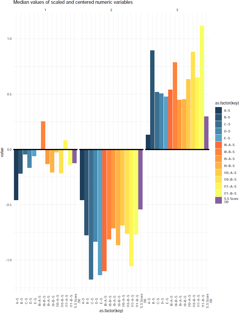 Employing the Z-score standardization method, we normalized the median values of numerical variables, including self-reported speed across all scenarios and sensation-seeking scores, to a common scale. This normalization facilitated equitable comparisons and enhanced the interpretability of clustering outcomes. Fig. (3) provides a visual representation of these scaled median values for each variable within Clusters 1, 2, and 3, illustrating the distinct driving behaviors and sensation-seeking tendencies across the clusters. Cluster 1's scaled median values are predominantly below the zero line, indicating a tendency towards more cautious driving behaviors relative to the overall sample mean. This pattern suggests that drivers in Cluster 1 adopt a moderate approach, positioning them as relatively cautious without veering into extreme conservatism. Cluster 2 is visually distinct, with its scaled median values significantly lower than those of the other clusters and deeply entrenched in the negative zone. This depiction underscores their highly cautious driving approach, identifying them as the most conservative group within the study. The pronounced deviation of their values highlights a marked preference for safety and a lower propensity for risk. Conversely, Cluster 3 is characterized by positively scaled median values across most variables, setting them apart as more inclined towards higher speeds and a greater tendency for sensation seeking. This positioning above the baseline signifies a bolder approach to driving, with a preference for speed and an elevated level of risk-taking compared to their counterparts.