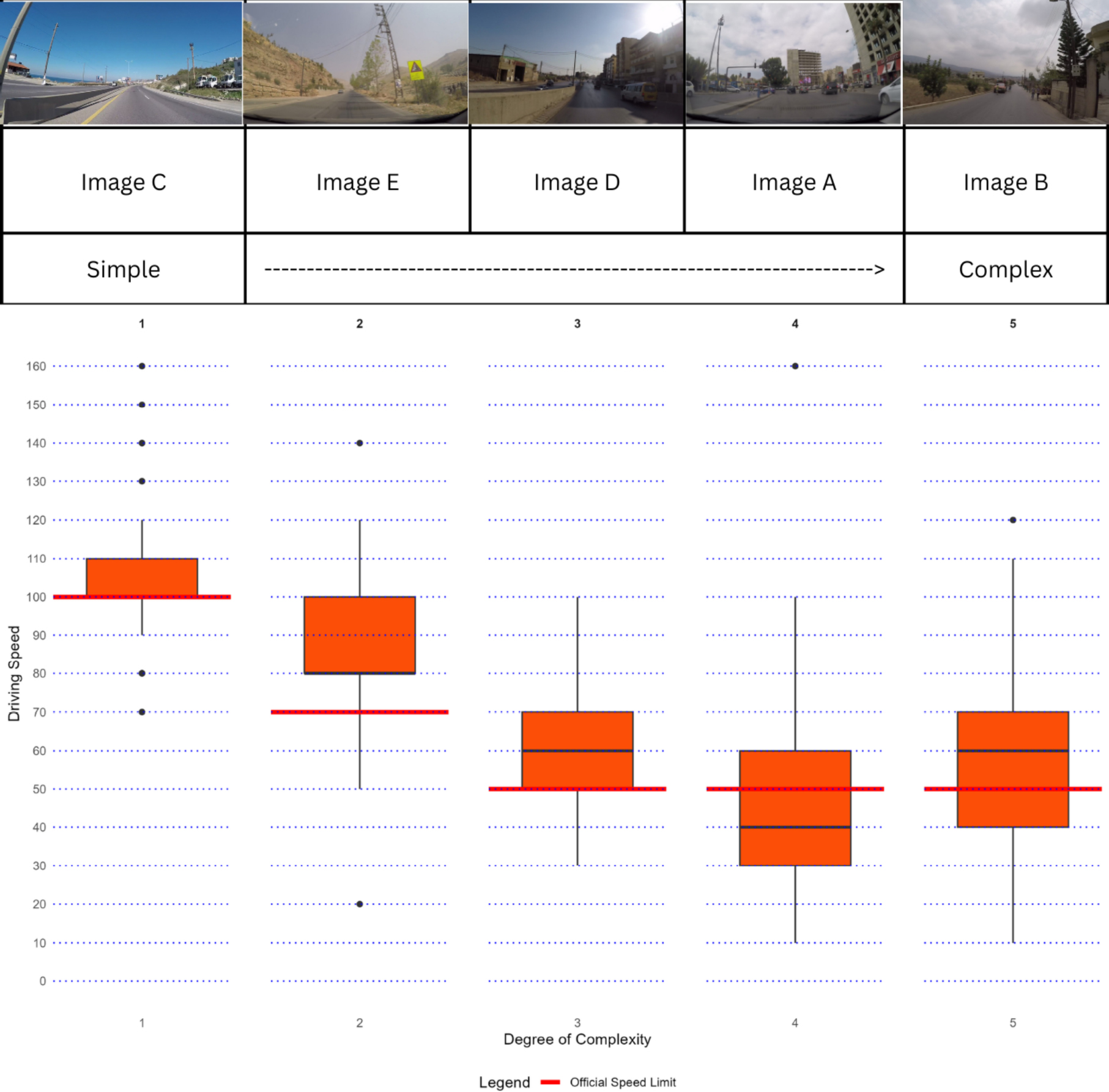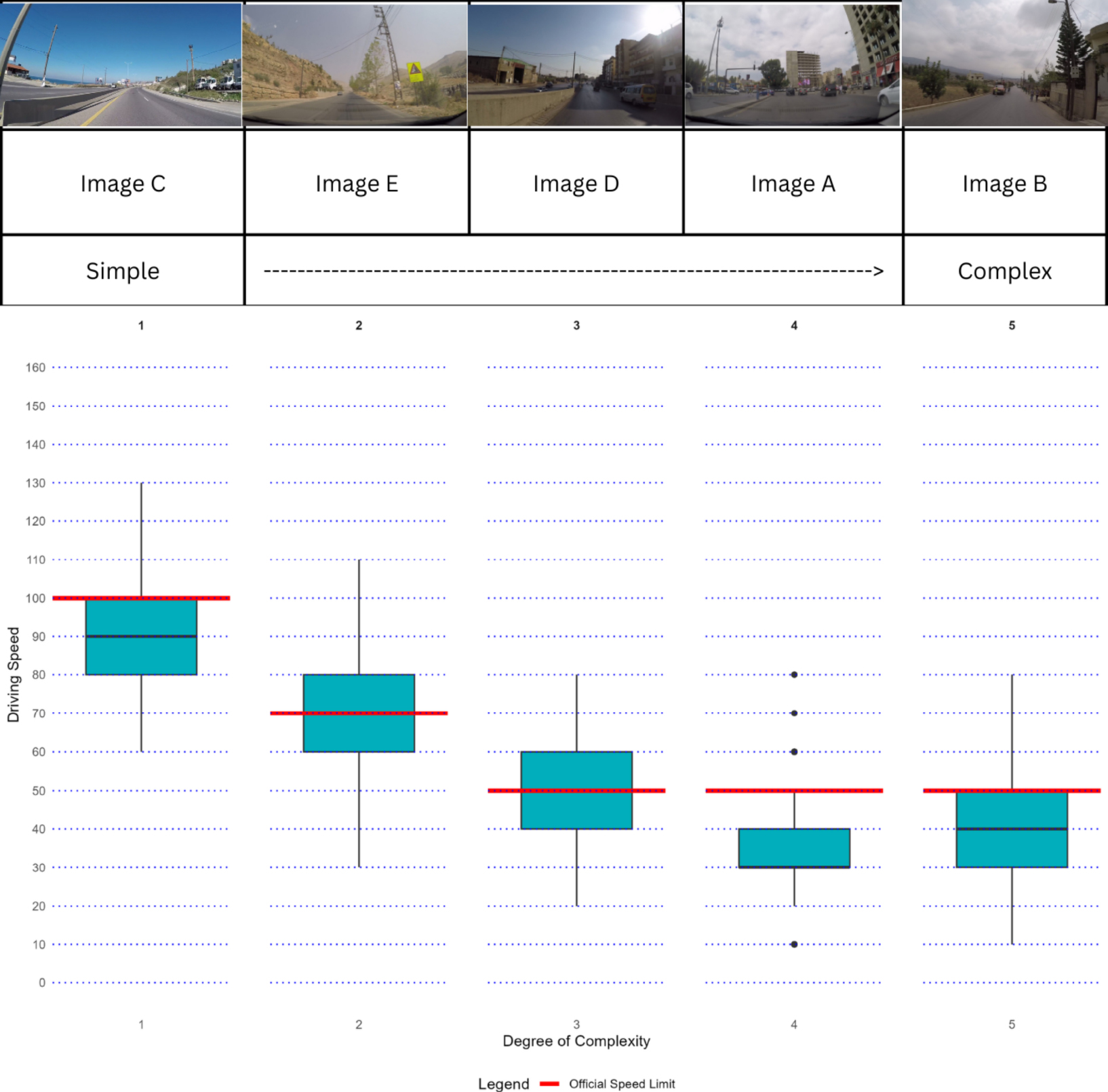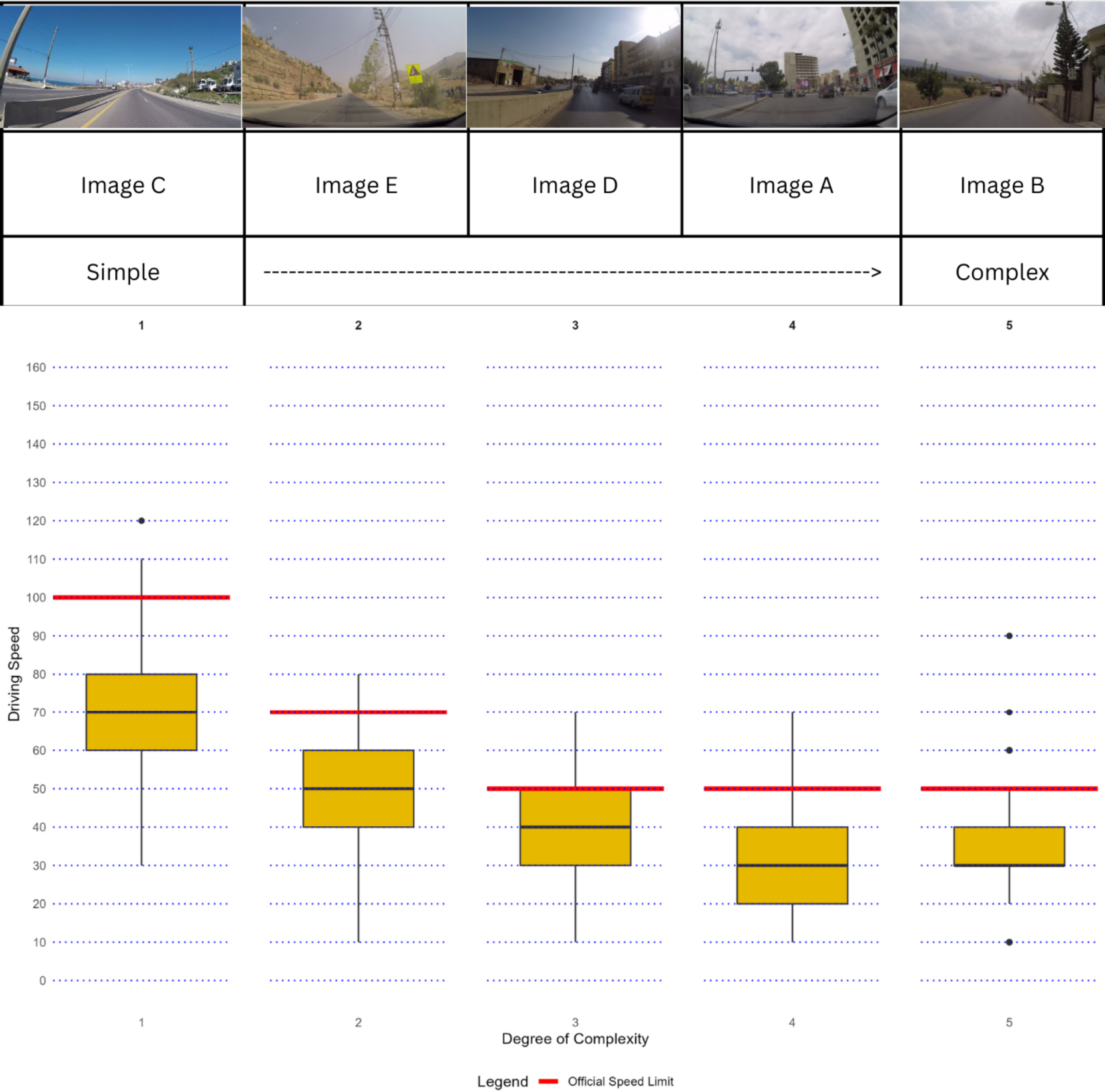 The primary purpose of this section was to examine the correlation between road complexity and self-reported driving speeds. To this end, ten images representing various Lebanese roads were previously selected and analyzed according to the criteria established in previous studies [31-35]. These images were then presented to experts to validate a complexity scale ranging from 1 (least complex) to 5 (most complex). Following this process, five images, each illustrating a distinct level of complexity and having reached a consensus among the experts, were selected for the survey. It should be noted that participants were not informed of the objectively determined levels of complexity. They were simply asked to observe the images and estimate the speed (in km/h) at which they would consider driving in the scenarios depicted. The images were presented to the participants as follows: