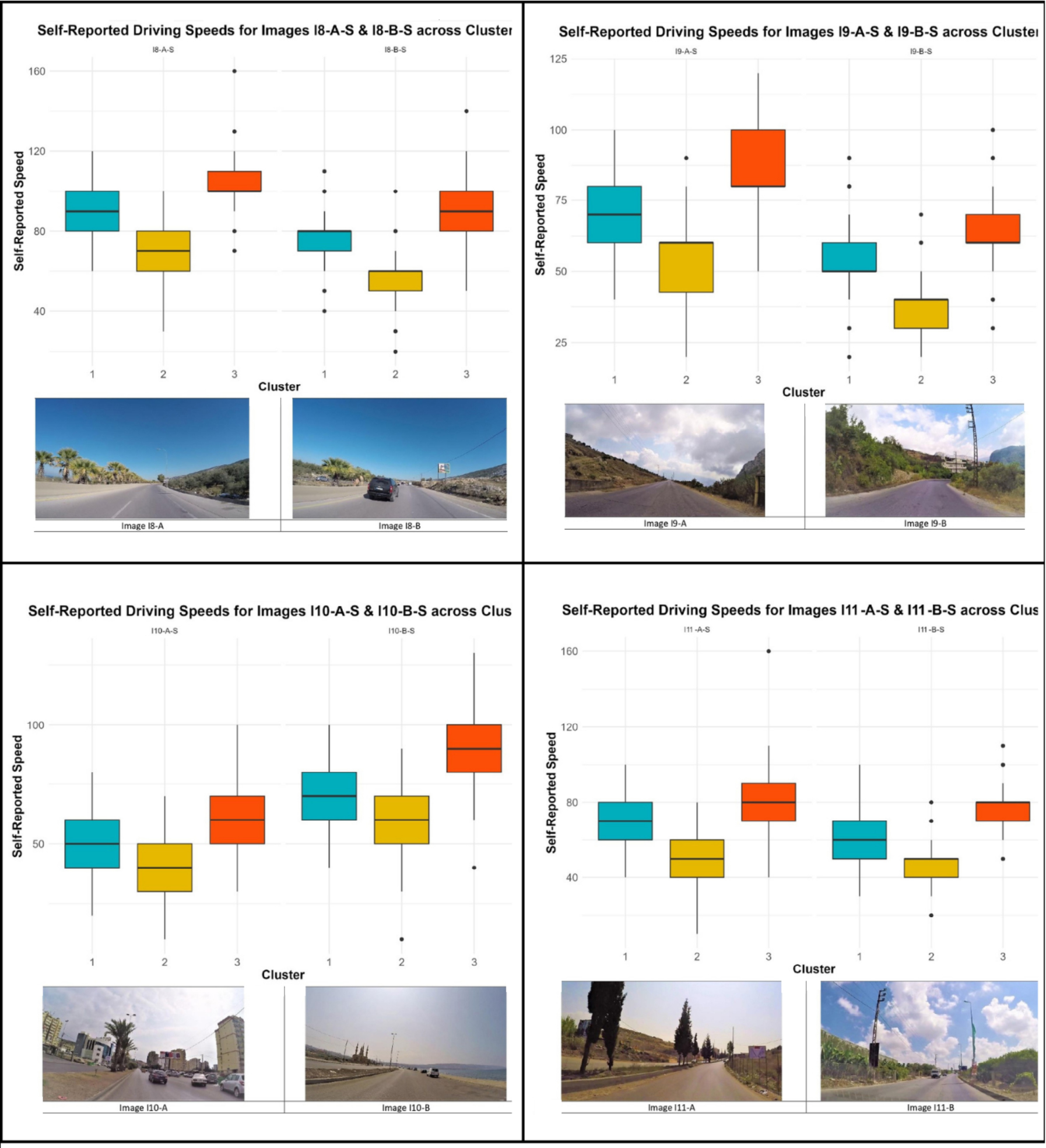 Cluster 3 drivers tend risk-taking, frequently surpassing speed limits in various road conditions, as shown in Fig. (6). In the least complex scenario (Image C), they precisely meet the 100 km/h speed limit, showing a willingness to utilize the maximum permitted speed. As road complexity increases (Image E), the median speeds slightly reduce to 80 km/h but remain above the 70 km/h limit, continuing a trend of risk-taking. This pattern of exceeding speed limits persists in more complex urban areas (Image D), with a median speed of 60 km/h, surpassing the 50 km/h limit and highlighting an indifference for safer driving practices. In more challenging conditions (Image A), while the median speed drops to 40 km/h, it still remains below but close to the 50 km/h limit, suggesting a minor adjustment towards caution yet not fully aligning with safety expectations. Surprisingly, in the most complex scenario (Image B), the median speed increases to 60 km/h, surpassing the speeds in Image A and breaching the 50 km/h limit, presenting a counterintuitive response to increased complexity. Overall, Cluster 3 drivers often engage in dangerous driving, especially when road conditions are less complex. While there is evidence of speed adjustment in response to complexity, the adaptations are often insufficient, failing to conform to safety standards expected in more challenging environments. This indicates a group of drivers who, despite recognizing greater complexity, do not consistently adjust their speeds to ensure safety.