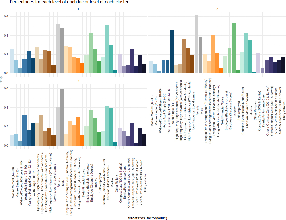 In-depth analysis of Cluster 1 revealed a demographic profile marked by a balanced gender distribution and a tendency towards more mature age groups, which correlated with conservative driving practices across different levels of road complexity. This observation aligns with existing literature highlighting the pivotal roles of age and driving experience in influencing cautious driving behaviors and a reduced inclination towards risk-taking [48-51]. Such evidence reinforces the significance of demographic factors in molding driving habits, affirming the necessity of incorporating these insights into road safety strategies. Previous research has reported that socio-economic status and household financial conditions significantly impact driving behavior, with financial constraints potentially leading to more cautious driving due to the higher costs associated with risk-taking [52, 53]. This heightened caution in Cluster 2 can be attributed to its demographic composition of younger, predominantly female drivers living under financial constraints with parents, suggesting that their conservative approach is driven by less driving experience and a higher sensitivity to potential risks. This study's findings align with this perspective, particularly in the case of Cluster 2. This reinforces the necessity to consider socio-economic backgrounds in road safety interventions and policy formulation. Cluster 3's analysis disclosed a tendency towards riskier driving behaviors among younger male drivers, a group characterized by financial stability and a diverse religious composition. This trend mirrors findings from prior studies identifying young males as more susceptible to engaging in risky driving, influenced by sensation-seeking and overconfidence [54-56]. The unique socio-cultural fabric of Lebanon, with its religious and regional diversity, introduces additional layers to the complexity of driving behaviors, highlighting the urgent need for culturally tailored road safety measures.
