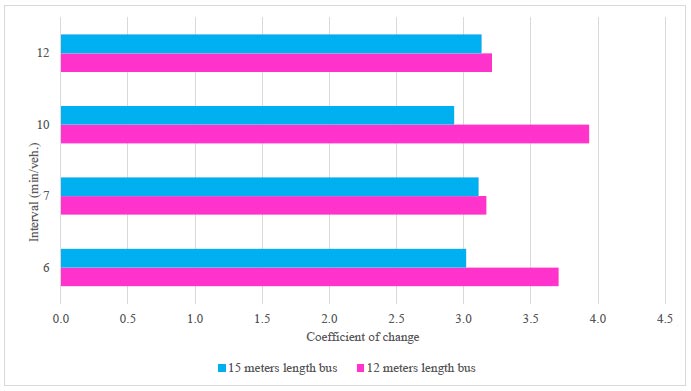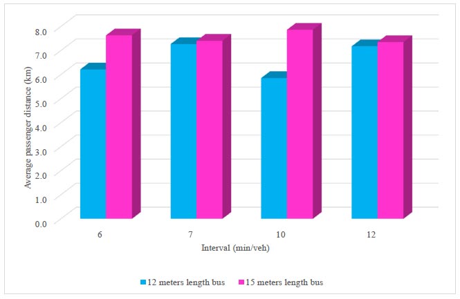 Two indicators related to the criterion of the number of passengers transported per traveled kilometer (passenger-kilometres) expressing the productivity of the transport process [4] have been calculated. These indicators are the average distance a passenger is transported and the coefficient of change of the route, i.e. how many times vehicle capacity is used during a trip. As shown in Figs. (10 and 11) for both indicators, the best option is a 15-metre length bus with an interval of 10 minutes/veh.