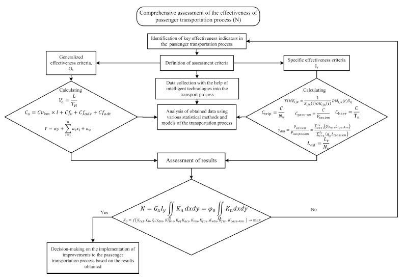 An integrated assessment of the effectiveness of the passenger transportation process with the use of intelligent technologies is a systematic approach to evaluation. This includes taking into account different aspects such as passenger service quality, safety, speed, punctuality, and efficient use of the resources [52-55], all of which provide a comprehensive and objective assess- ment of the efficiency of the transportation process and identify areas for improvement.