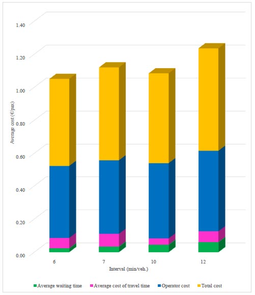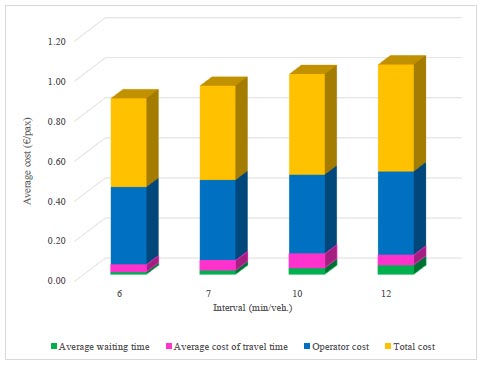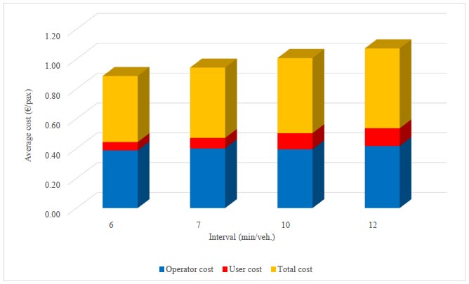 The results show that due to external factors related to overcrowding, the total cost decreases at the same rate for both 12-meter and 15-meter buses at different intervals, while the number of passengers transported per kilometer increases at a faster rate for larger-size buses. Hence, larger size buses operate at lower occupancy rates, which improves the quality of service through less overcrowding and lower waiting costs. In addition, the use of larger-sized buses can significantly reduce or eliminate boarding denials. Thus, larger buses can be economically viable, even with fewer passengers than smaller buses, resulting in a significant improvement in the quality of the service.