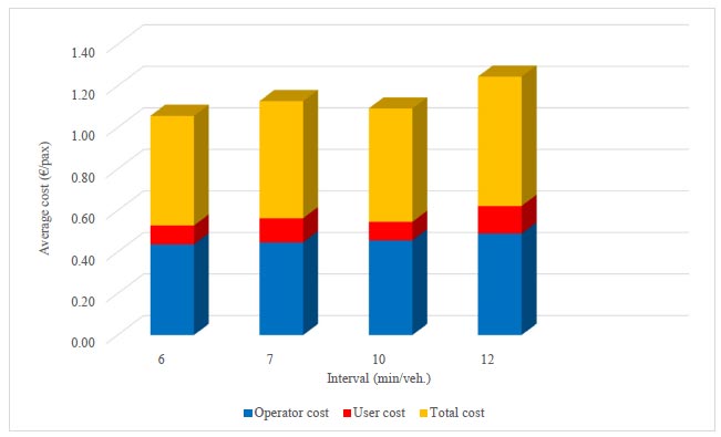 The variables affecting these criteria are vehicle interval and vehicle size (12 meters in length for articulated buses and 15 meters for large buses). There is a limited number of possible solutions that must be evaluated for each vehicle size to find the optimal solution that results in the lowest total cost and the highest number of passenger-kilometers transported. For example, for our experiment in Havana, taken as an illustrative example of a corridor with high passenger volume (2375 passengers per hour), the min interval and max interval are set at 5 and 12 minutes, respectively (i.e., fmin 5 and fmax 11 (veh/h), i.e., the set of intervals is considered as {5, 6, 7,.... 11 [veh/h], which contains a total of 6 elements. Therefore, for 2 different bus sizes, there are 6 × 2 = 12 possible solutions.