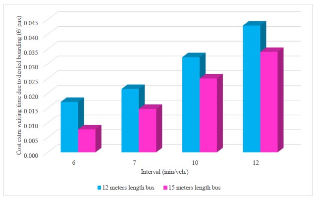 As for the cost of extra waiting time due to denied boarding, as can be seen in Fig. (8), it decreases for larger vehicles with lower intervals.