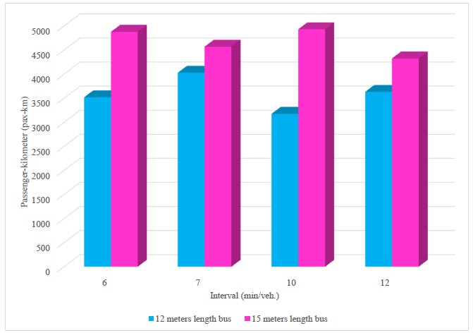 With respect to the criterion of number of passengers transported per travelled kilometre (passenger- kilometres), Fig. (9) shows that the best option is to use a 15-metre bus with a 10-minute interval (frequency of 6 veh/hour).
